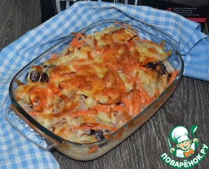 Залить соусом овощи, сверху разложить натёртые сыры.