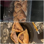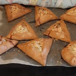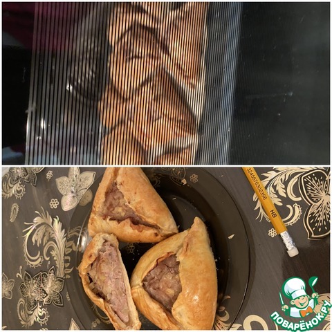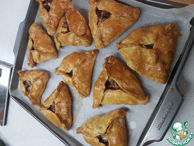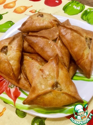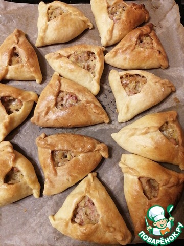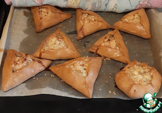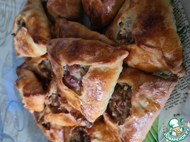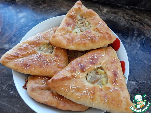 5. Тесто разделить на 12 равных частей и сформировать шарики. Каждый шарик раскатать в пласт диаметром примерно 15 см. В центр положить небольшое количество начинки (примерно 2 ст. л.), соединить края теста, хорошо защипнуть, формируя треугольники;