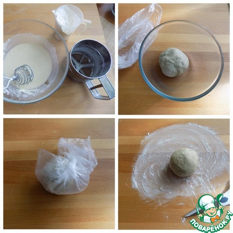 Я буду делать булки сладкими и с ароматом ванили. Делаем тесто. Рассол наливаем в посуду, гасим в нём соду, выкладываем сахар и ванильный сахар, соединяем венчиком. Просеиваем муку и замешиваем тесто сначала лопаткой силиконовой, а затем работаем руками. Скатываем тесто в шар и помещаем в пакет, кладём на 30 минут в холодильник. Можно время увеличить. Достаём тесто из холодильника, выкладываем из пакета и обминаем.