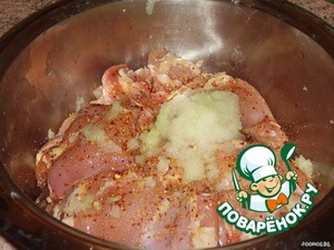 С куриных ляшек снять кожу и отделить мясо от косточки. Сложить в миску, туда на терке потереть лук и добавить соевый соус, соль и перец. Аккуратно перемешать и дать постоять 30мин.