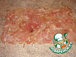 На стол расстелить пищ. пленку. Куриное мясо отбить в лепешки толщиной примерно 0,5-0,8мм (отбивать курицу надо аккуратно, а то она будет летать по всей кухне. Я отбиваю сначала внутреннюю сторону а потом наружную)Края должны быть потоньше, чем середина. Лепешки сложить на пленку в нахлёст друг с дружкой.