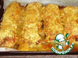 Яйцо взбить с водой и смазать хорошенько рулеты. Кукурузные хлопья немного подавить, чтобы они не были очень крупными. Посыпать рулеты и в духовку 180гр на 20мин. Через 20 мин. посыпать их тертым сыром и еще на 10-15мин.