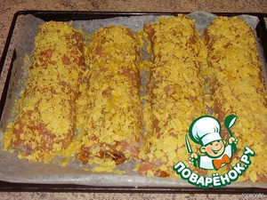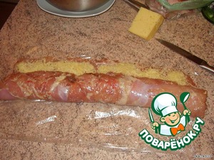 Свернуть рулет как на фото. Только не с пленкой. Ее надо аккуратно снимать по ходу сворачивания. Если рулет где то разошелся, не беда. Сыр при жарке закроет это место. Рулет завернуть обратно в эту же пленку и немного выдавить воздух. Вместе с пленкой положить на противень и тогда ее можно снять.