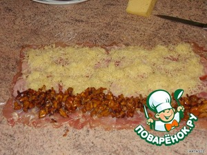 На простыню из курицы положить нарезанную ветчину отступив от краев на пару см. Сверху посыпать тёртым сыром. А в середину будущего рулета положить жаренные грибы.