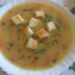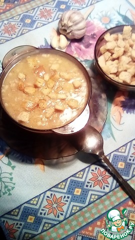 После закипания, убавляем огонь до минимума, накрываем крышкой, варим минут 10-15, если горох не совсем перемолот в муку то минут 20-25, смотрите по готовности. В самом конце можно добавить чеснок, но это по желанию. Подаем на стол с сухариками.