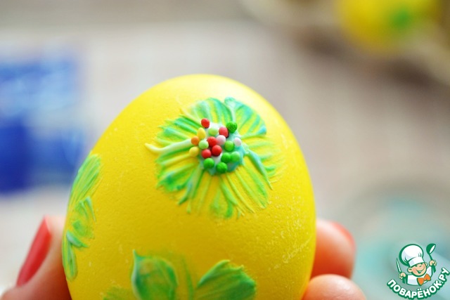 Посыпка прилипнет к сырой зубной пасте, а когда паста высохнет - то посыпка приклеится. Только намазать надо "пожирнее", потому что часть зубной пасты может впитаться в скорлупу.