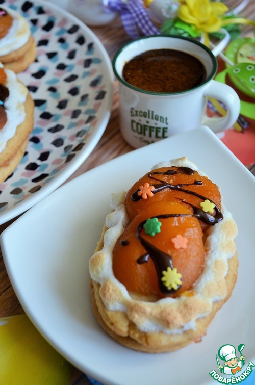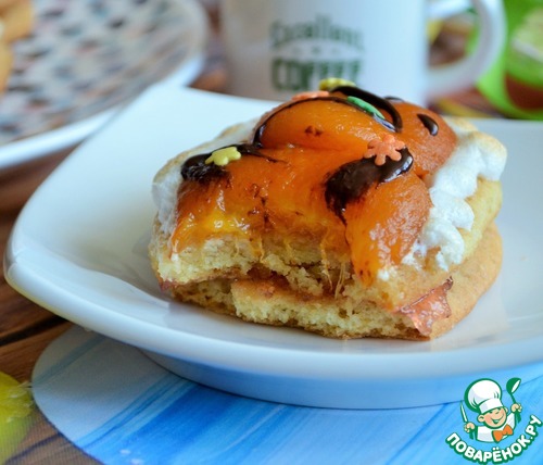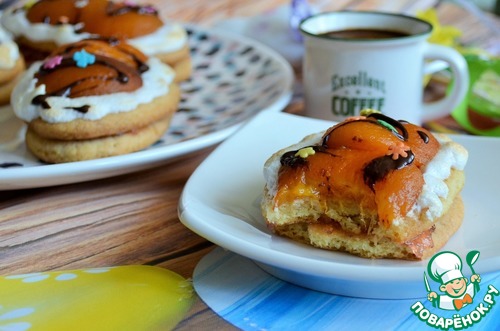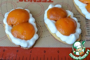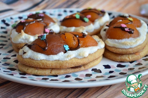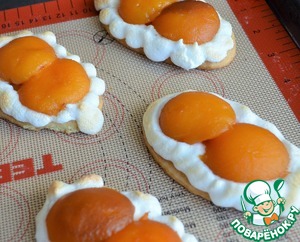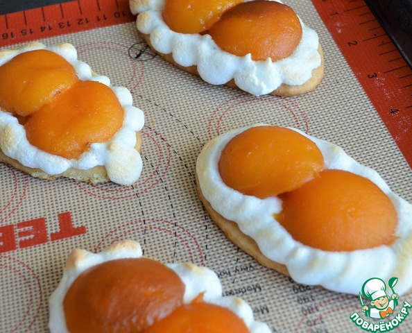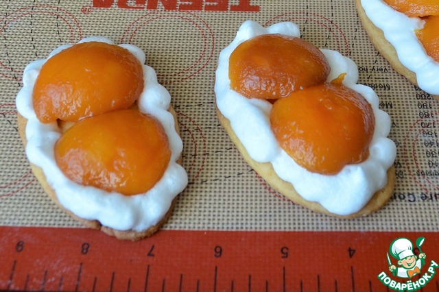Печенье разделить на две части. На одну половину нанести белковую массу, в середину поместить по две половинки абрикоса. -