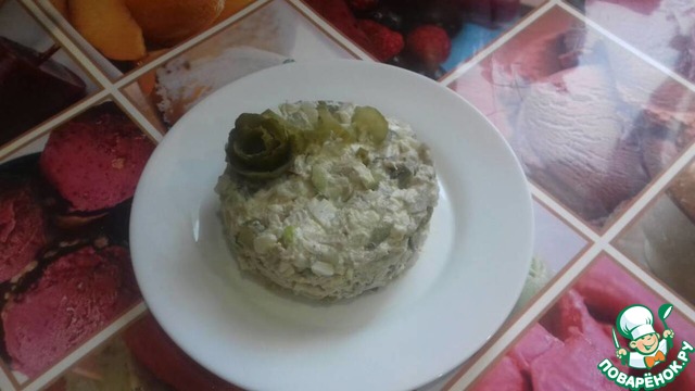Подготовить продукты. Отварить куриное филе и разобрать на волокна. Обжарить шампиньоны с репчатым луком. Соленые огурчики и яйца нарезать кубиком. Добавить майонез и соль по вкусу. Все перемешать и отправить на 30 минут в холодильник.