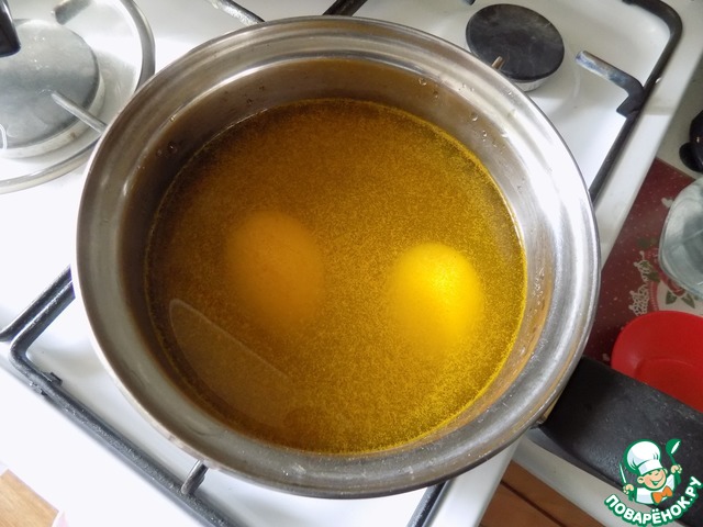 Для примера я сегодня разрисую два яйца. Вначале нужно сварить яйца. Я буду варить яйца в подсоленной воде, а чтобы они были золотистые, я окрашу их куркумой-натуральный краситель. Яйца варите так, как вы привыкли.