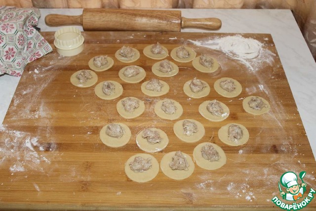 Раскатываем тесто. Вырезаем кружочки. Выкладываем фарш.