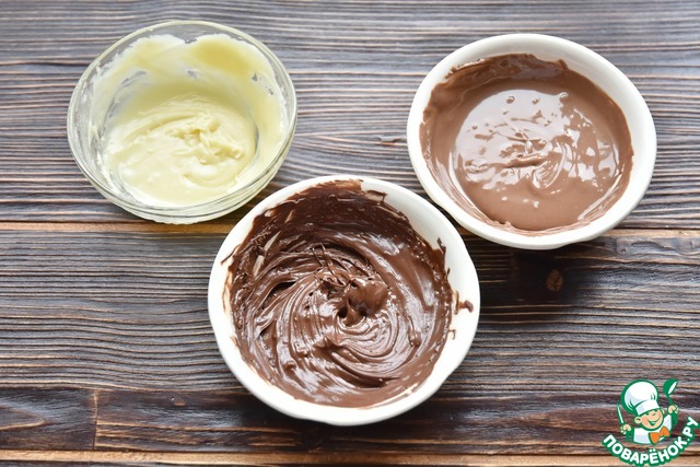 • В трех отдельных мисках растопить три вида шоколада используя любой доступный способ (водяная баня, микроволновка).