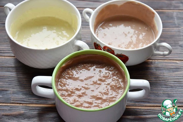 • Разделить творожную массу на неравные три части. Меньшую часть соединить с белым шоколадом. Среднюю с молочным, большую часть смешать с темным шоколадом.