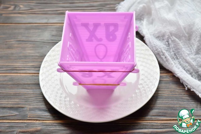 • Свободные концы марли подвернуть сверху. Поставить пасху в холодильник, не менее чем на 12 часов.
