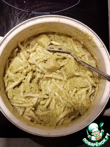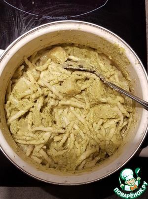 Слейте почти всю воду. Добавьте песто. Перемешайте. Когда остается немного воды-легче перемешивать. Соус получается более текучий. Паста получается более "соусная".