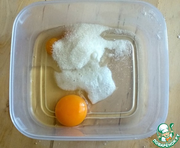 Отдельно соединить яйцо, желток, сахар и соду, гашенную уксусом.