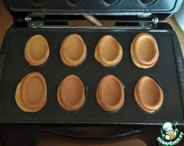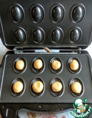 После сформировать маленькие шарики, примерно по 7-8 гр. каждый. В мультипекарь REDMOND поставить панели для орешков, включить. Когда загорится зелёный индикатор, можно начинать готовить. Разложить шарики из теста в ячейки.