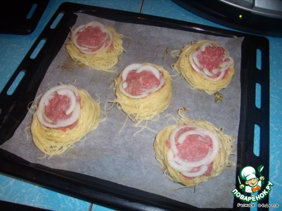 Выкладываем гнезда на противень, даем остыть, кладем в серединку подсоленный фарш.
