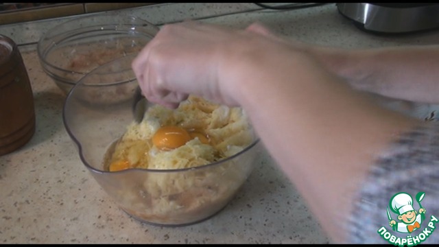 Картофель посолим, поперчим по вкусу, добавляем два яйца и муку. Хорошо размешаем.