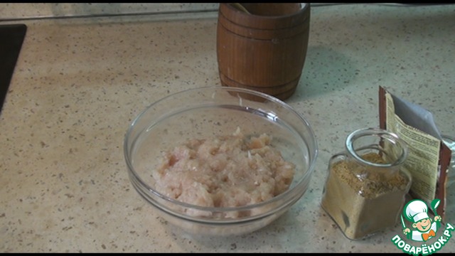 Куриное филе пропускаем через мясорубку или блендер вместе с луковицей. Посолим, поперчим, добавляем любые специи по вкусу. Я добавила сухой чеснок и карри. Хорошо размешаем, наша начинка готова.