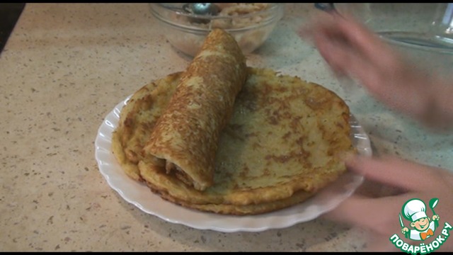Сворачиваем блинчик с начинкой в рулет.