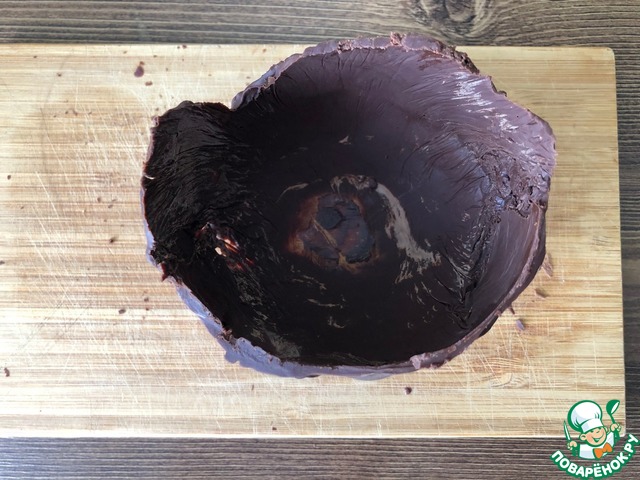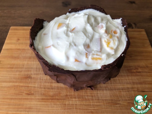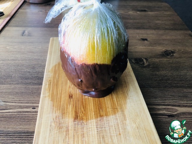 Окунаем манго в шоколад. Шоколадный слой делаем как можно толще. Ставим «яйцо» на доску покрытую пищевой плёнкой И оставляем до полного застывания.