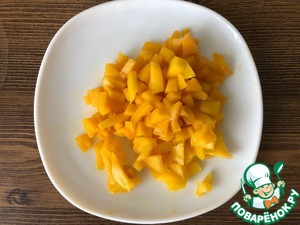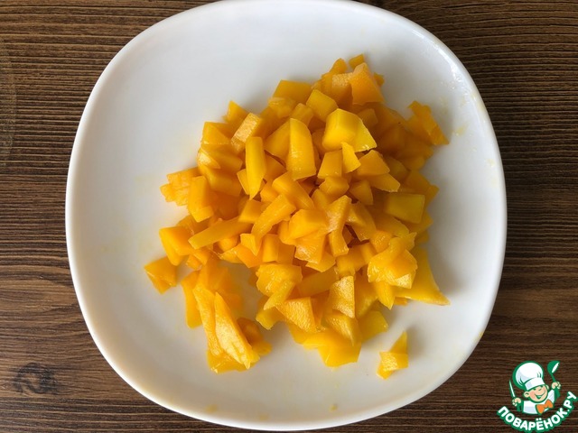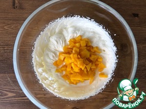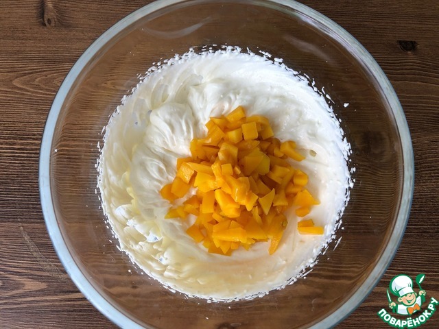 Мягкий творог взбиваем со сгущёнкой, а затем добавляем кусочки манго, перемешиваем.