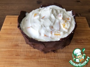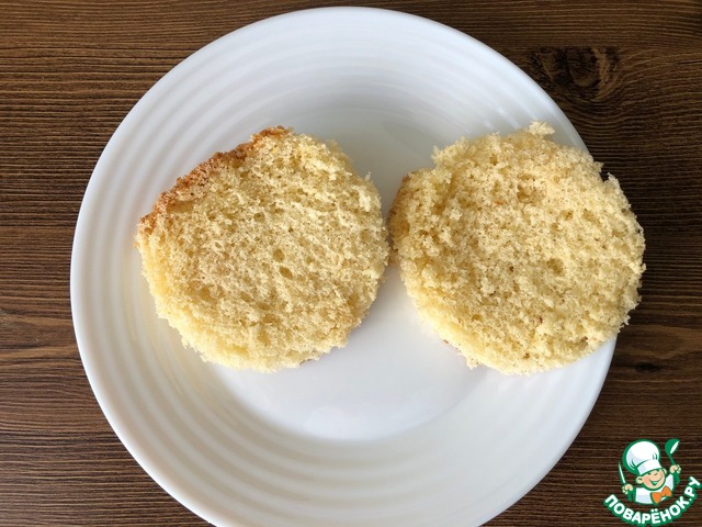 Формируем пирожное. На дно «яйца» выкладываем бисквит и покрываем творожным кремом.