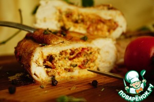 Переворачиваем и перчим, солим сверху малое филе. Только сверху. Кармашек изнутри солить и перчить не нужно. Т. к. фета соленая. Но если вместо феты возьмете, например, адыгейский сыр, который пресный. Ну или маскарпоне, тогда начинку стоит подсолить.