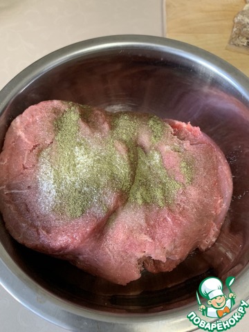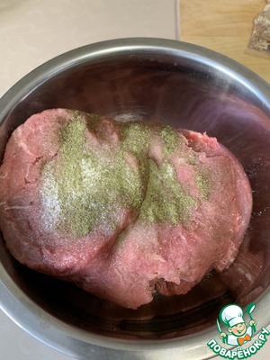 Фарш солим, приправляем хмели-сунели и хорошо вымешиваем. -