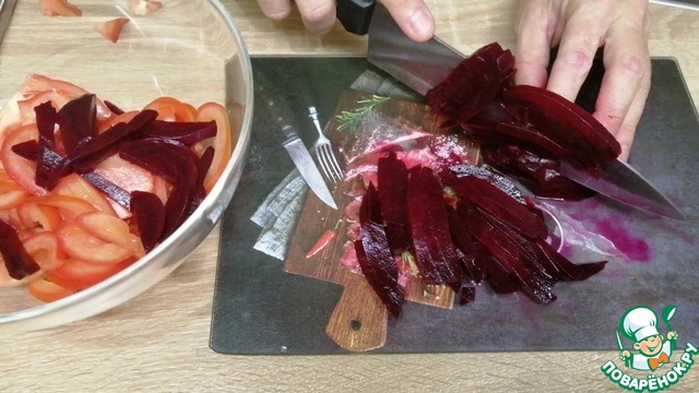 Свежие помидоры нарезать полукольцами, а отварную свеклу соломкой. Положить в глубокую миску