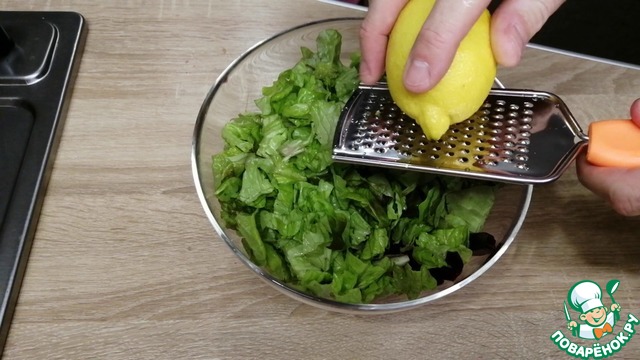 Листья салата порезать поперек по 2 см и отправить в миску к помидорам и свекле, посолить, измельчить черный перец, выдавить сок лимона, натереть лимонную цедру, заправить оливковым маслом и хорошо перемешать.