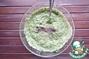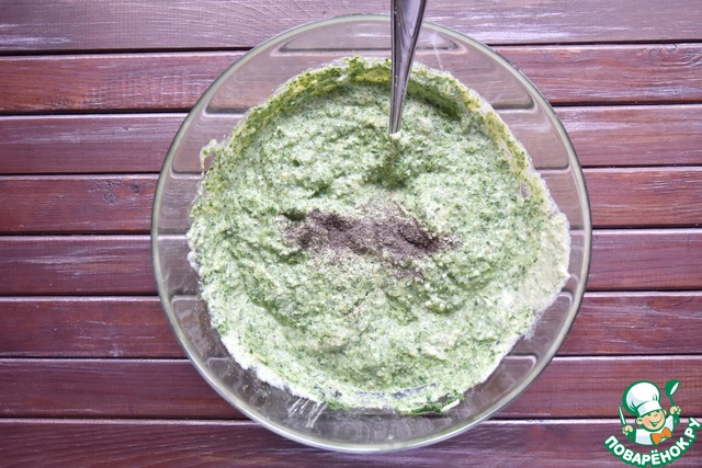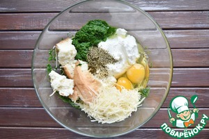 Для начинки соединить измельченный шпинат, натертый пармезан, рикотту, три сырых яйца, кусочек булки, замоченной в молоке.