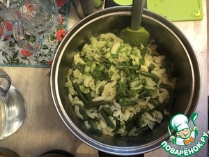 После варки откинуть макароны и фасоль и добавить травяную смесь. Все тщательно перемещать.