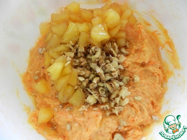 В тесто добавить карамелизированные яблоки и рубленные орехи. Аккуратно перемешать.