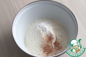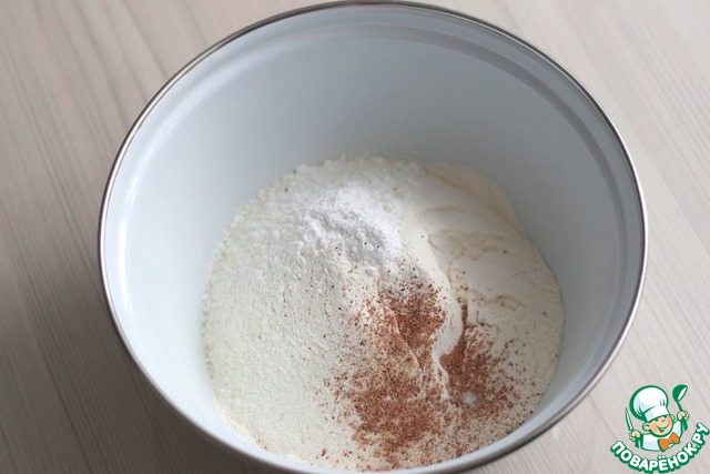 В миску добавить муку (280 гр.), добавить натертый мускатный орех (1 ч. ложка без горки), добавить разрыхлитель (1 пак.). Сухие ингредиенты перемешать.