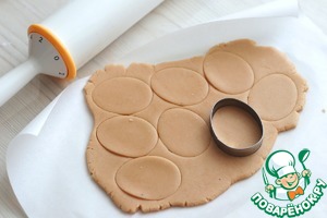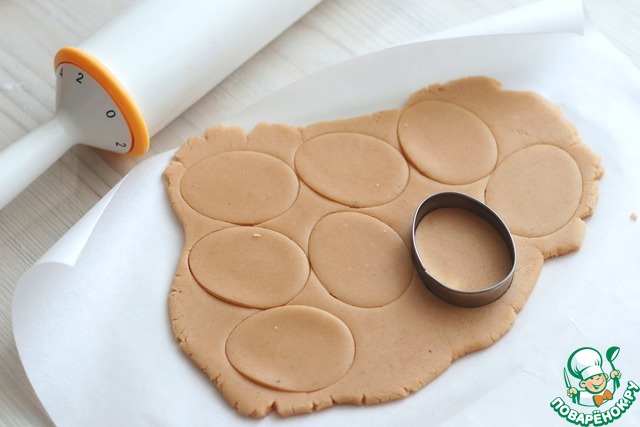 Далее тесто раскатать между двумя листами пергаментной бумаги толщиной 6-7 мм. в пласт. Формочками для печенья вырезать фигурки в форме яиц.