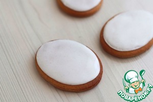 Середину заполнить цветной глазурью. Хочу обратить внимание, для заполнения середины печенья следует сделать более жидкую по консистенции глазурь. Для этого: часть глазури выпустить в небольшие мисочки и добавить несколько капель кипяченой воды. Обычно бывает достаточно 3-5 капель.