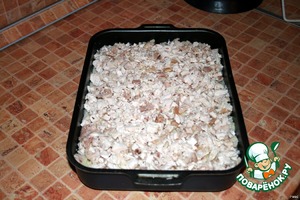 сверху слой нарезанного куриного мяса,(посыпьте молотым черным перцем),