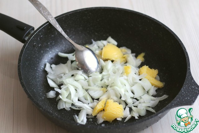 На сковороде растопить 2 ст. ложки топленого сливочного масла, добавить нашинкованный репчатый лук. -