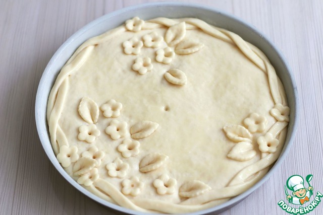 Далее поверхность пирога смазать взбитым яйцом и оправить в разогретую до 180*С духовку.