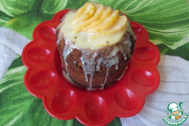 Срезаем у кулича горбик, поливаем разрез персиковым сиропом, украшаем тонкими дольками персика. Я растопила треть белой шоколадки и немного полила куличик. Можно просто присыпать сахарной пудрой или украсить по своему желанию.
