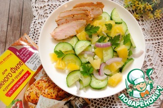 Укладываем салат в сервировочное кольцо. Украшаем тонкими ломтиками куриного филе и оставшимся горошком. Снимаем кольцо и сразу подаем на стол. Даже мой нелюбитель салатов съел свою порцию с большим удовольствием.