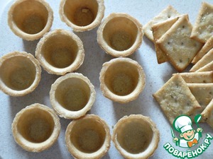 Подготовить тарталетки. Я рассчитывала начинку для больших тарталеток, но у меня нынче мини, поэтому я взяла ещё и крекер, также можно использовать ломтики хлеба, предварительно фигурно нарезать и подсушить в духовке, тостере или на сухой сковороде.