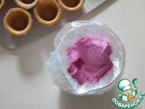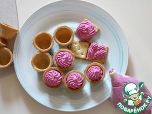 Взбитой массой наполнить кондитерский мешок, или вложить фигурный наконечник в п/э пакет, туго завязать