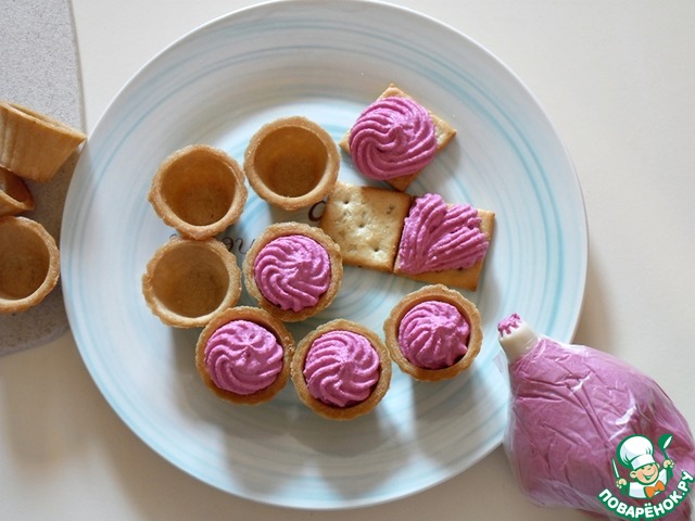 и наполнить тарталетки. Оставшуюся массу выдавить на крекер.