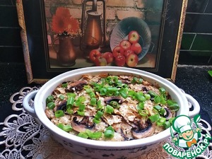 Форму смазать маслом, выложить мацовую смесь. Разровнять. Сверху украсить порезанными грибами и разложить кусочки сливочного масла. В оригинале был маргарин, но я делала с маслом.