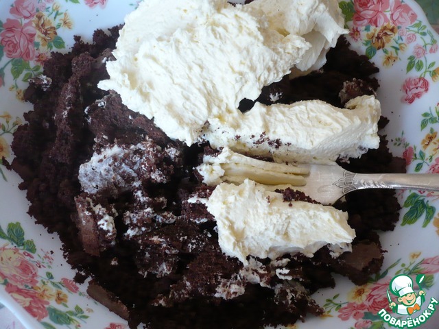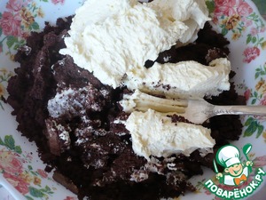 Добавьте 2-3 ст. л. крема в миску с обрезками бисквита и разомните вилкой, чтобы они стали влажными.
