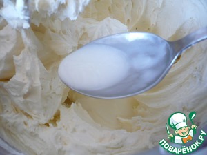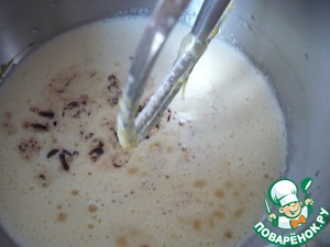 Добавьте ванилин и взбивайте на умеренно высокой скорости 2-3 минуты до воздушной консистенции. Добавьте молоко и перемешайте до однородности.