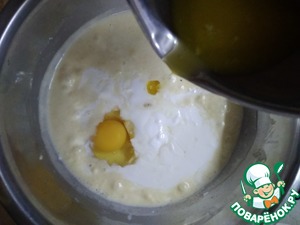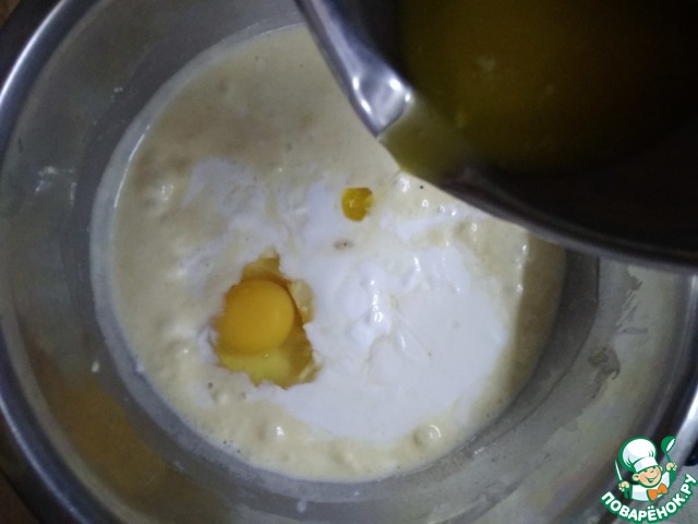 В опару добавить яйцо и сметану. Растопленное сливочное масло комнатной температуры и растительное.. Перемешать.