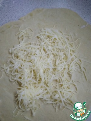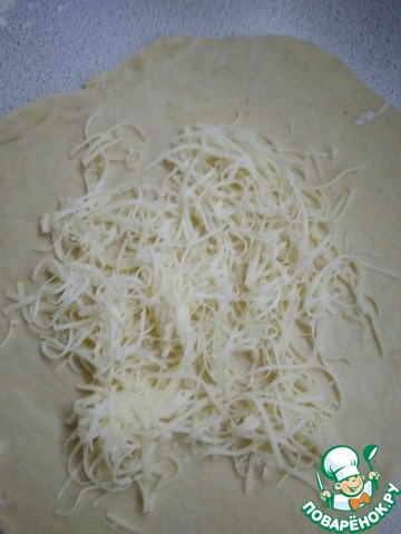 Каждую часть раскатать., положить сверху сыр с зеленью. -
